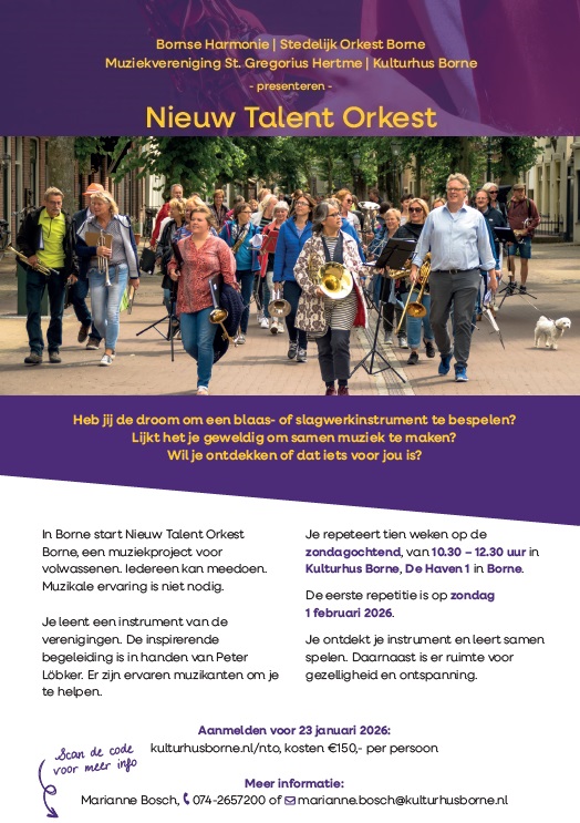 Afgelopen week heeft Muziekvereniging St. Gregorius Hertme, bestaande uit een Percussion Group en Fanfare, samen met de Bornse Harmonie, Stedelijk Orkest Borne en Kulturhus Borne een samenwerkingsovereenkomst ondertekent die ons verbindt in het Borns Muziek Collectief (BMC) en waarin we onze krachten bundelen om de lokale muziekcultuur in de gemeente Borne te versterken. Aansluitend hebben we als BMC de opmaat gegeven voor het Nieuw Talent Orkest; dit is een laagdrempelig orkestproject waarmee we op 1 februari 2026 starten en waarbij volwassenen uit Borne, Hertme, Zenderen en daarbuiten zonder muzikale ervaring een blaas- of slagwerkinstrument leren bespelen én samen muziek maken. Iedereen mag meedoen, want muzikale ervaring is handig, maar niet benodigd. Heb jij de droom om een blaas- of slagwerkinstrument te leren spelen en lijkt het je geweldig om samen muziek te maken? Ga direct naar kulturhusborne.nl/nto voor meer informatie, geef je direct op en ontdek het plezier van samen muziek maken!!